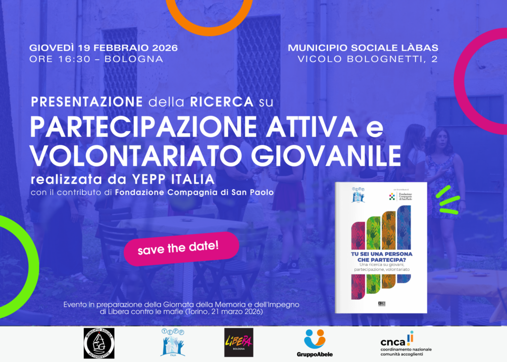 I giovani del gruppo YEPP Forlì illustreranno la propria esperienza di partecipazione attiva alla vita della comunità, sostenuta dalla Fondazione Cassa dei Risparmi di Forlì L’evento è in collaborazione con Libera Bologna, Coordinamento Nazionale Comunità Accoglienti, Gruppo Abele e Làbas.